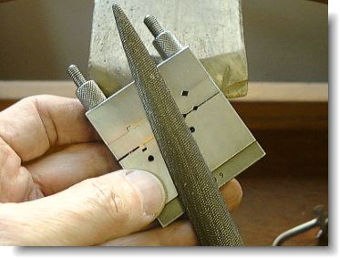 Filing the ring blank perfectly square in a filing jig.