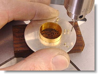 With the already drilled holes in the silver core as a guide, the rivet holes in the first stainless blank are now drilled. The gold band and the rivets in the already drilled holes, keep the parts lined up perfectly.